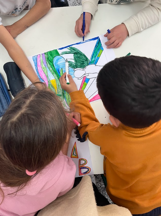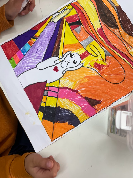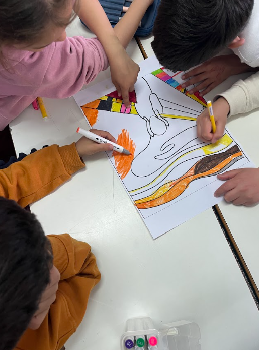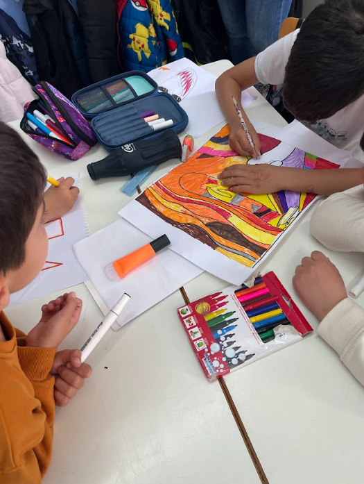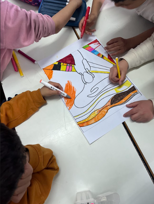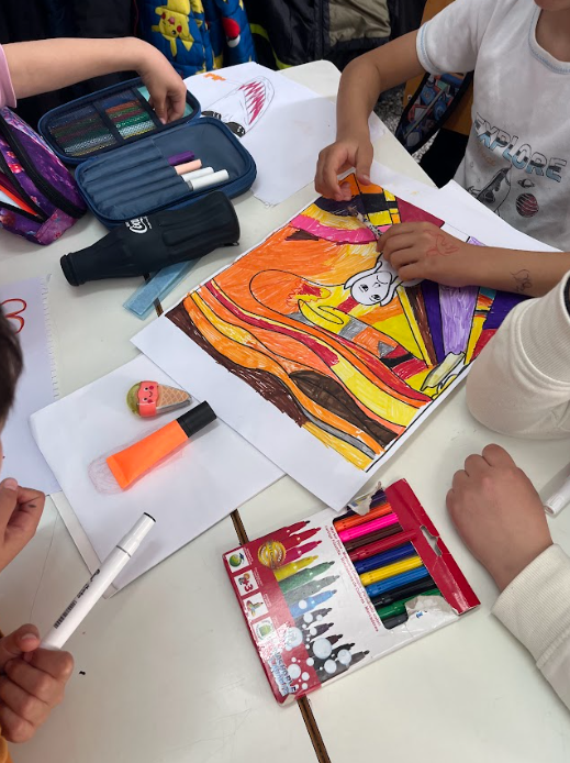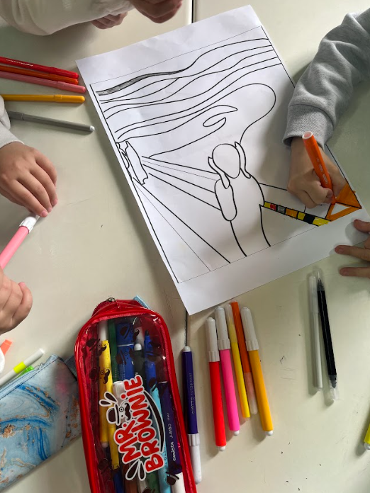 Στη συνέχεια, οι μαθητές αποτύπωσαν εικαστικά τη διαφορά ανάμεσα στο «πριν» και το «μετά». Χρησιμοποιώντας ως βάση το έργο «Η Κραυγή», γέμισαν το φόντο με συναισθήματα και αποτύπωσαν στο σώμα τις σωματικές αντιδράσεις — τόσο σε στιγμές φόβου όσο και σε στιγμές χαράς.