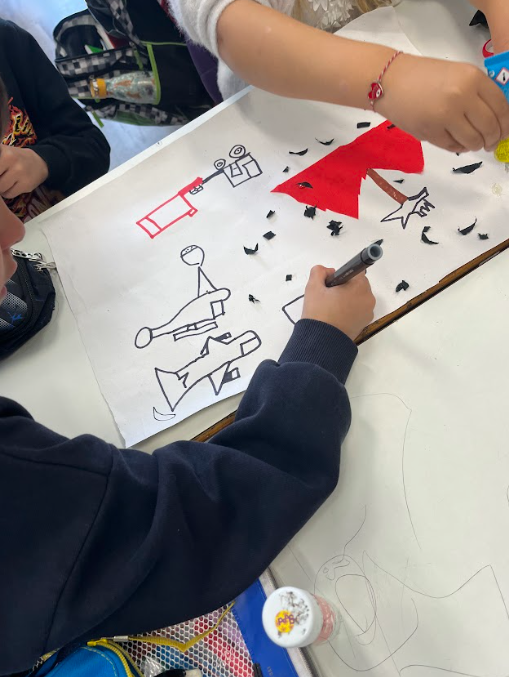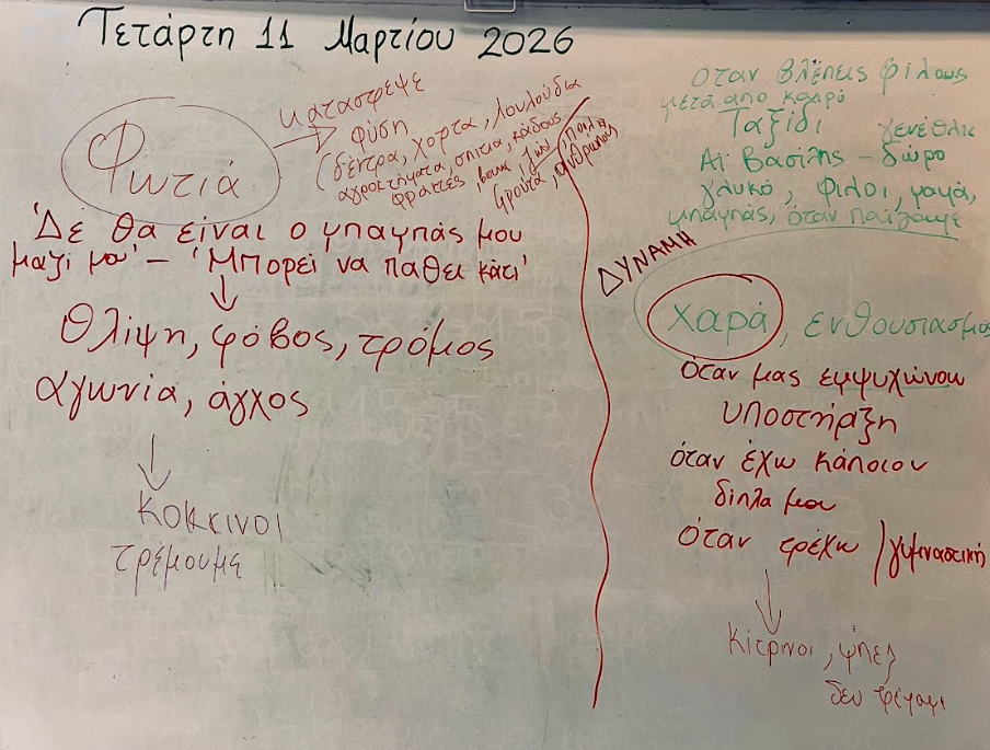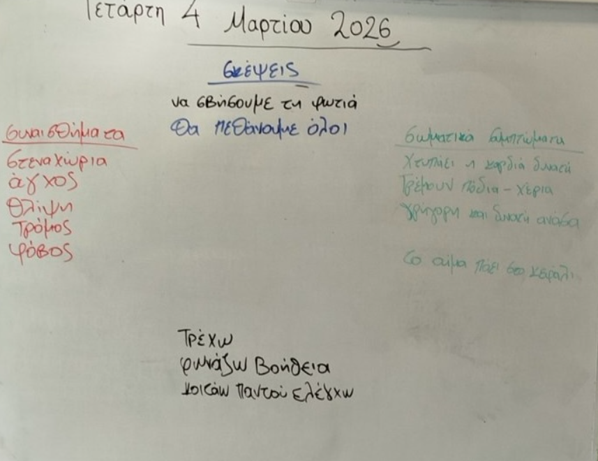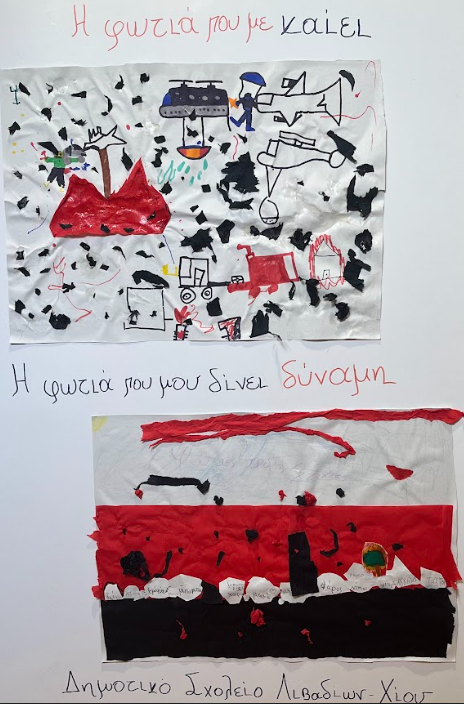 Στη συνέχεια, μέσα από διαδραστική συζήτηση, μίλησαν για τη φωτιά που επηρέασε τη Χίο, εκφράζοντας σκέψεις, συναισθήματα και σωματικές αντιδράσεις. Παράλληλα, κατέγραψαν στον πίνακα τα συναισθήματά τους με ζεστά και ψυχρά χρώματα, συνδέοντας την εμπειρία της καταστροφής με την ένταση, αλλά και με την ελπίδα και την αναγέννηση.