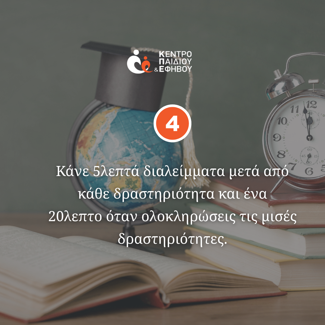 Τα διαλείμματα είναι εξίσου σημαντικά με το ίδιο το διάβασμα, ένα μικρό διάλειμμα 5 λεπτών ανάμεσα στις δραστηριότητες και ένα μεγαλύτερο, 20 λεπτών, όταν έχει ολοκληρωθεί η μισή δουλειά, δίνουν στο παιδί τον χρόνο να πάρει ανάσα, να ξεκουραστεί και να επιστρέψει με περισσότερη διάθεση και καθαρό μυαλό. Εκεί οι γονείς μπορούν με μια ενθαρρυντική κουβέντα, και με μικρές κινήσεις που έχουν τεράστια συναισθηματική αξία, να προσφέρουν στο παιδί θάρρος. Επίσης είναι η κατάλληλη στιγμή για ένα μικρό υγιεινό σνακ το οποίο δεν προσφέρει μόνο ενέργεια, αλλά και το αίσθημα φροντίδας που χρειάζεται το παιδί για να συνεχίσει την μελέτη του.