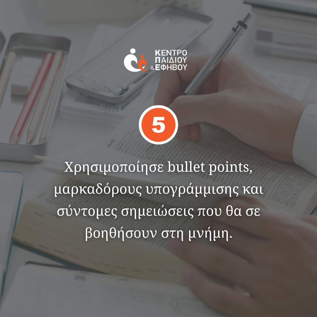 Τέλος, εργαλεία όπως οι σύντομες σημειώσεις, τα bullet points και οι μαρκαδόροι υπογράμμισης βοηθούν το παιδί να οργανώσει τη σκέψη του και να συγκρατήσει πιο εύκολα τις σημαντικές πληροφορίες. Όταν οι γονείς δείχνουν ενδιαφέρον γι’ αυτά, ρωτώντας τι έμαθε ή τι ξεχώρισε, το παιδί νιώθει ότι η προσπάθειά του αξίζει και αναγνωρίζεται.