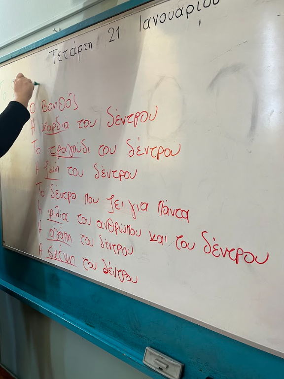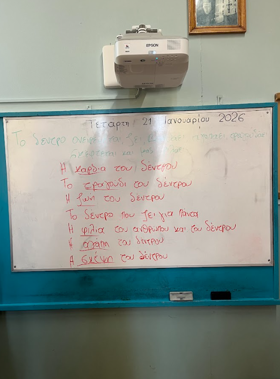 Έτσι, τα παιδιά συνειδητοποίησαν πως ακόμη και σε περιόδους κρίσης, τα συναισθήματα συνυπάρχουν — δεν είναι ποτέ ένα μόνο. Στη συνέχεια, μέσα από απλές ασκήσεις ενσυνειδητότητας, έμαθαν να επιστρέφουν στο σώμα και στην αναπνοή: εισπνοή σαν να μυρίζουν ένα λουλούδι, εκπνοή σαν να σβήνουν ένα κερί. Το εργαστήριο ολοκληρώθηκε με κάτι ιδιαίτερο: κάθε παιδί έδωσε φωνή στο δέντρο και όλες οι φωνές μαζί έγιναν ένα συλλογικό βιβλίο.
